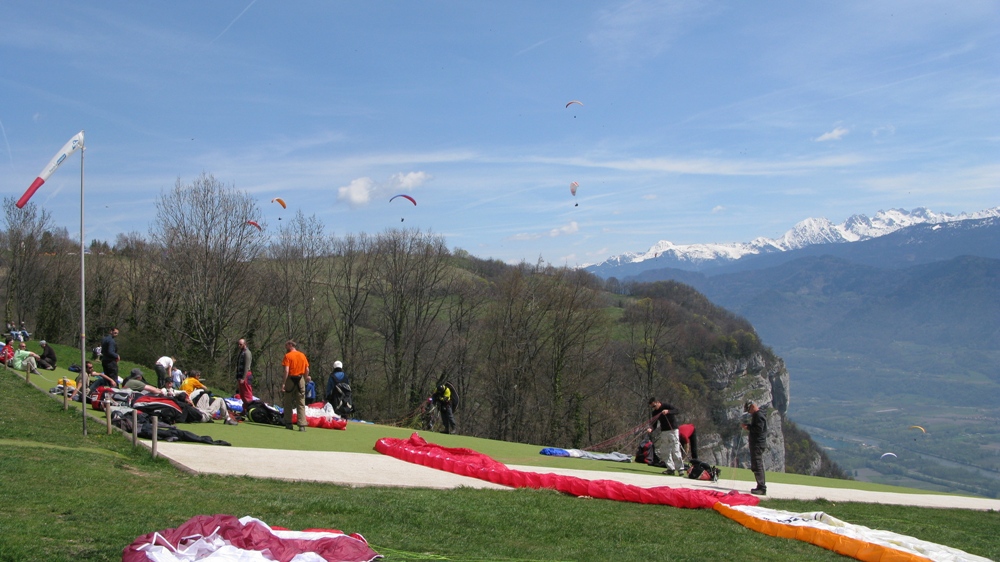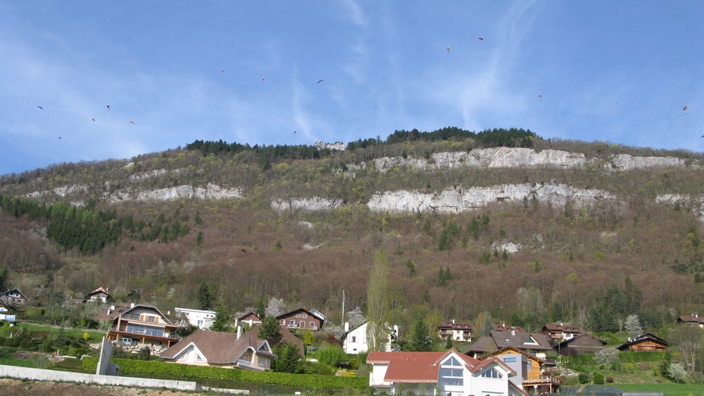 Effectivement, on arrive à Montmin, mais en dessous des falaises. Malgré quelques efforts désespérés, je n’arrive pas à raccrocher dans la faible brise. (Il y a des dizaines de voiles qui tournent encore au dessus).